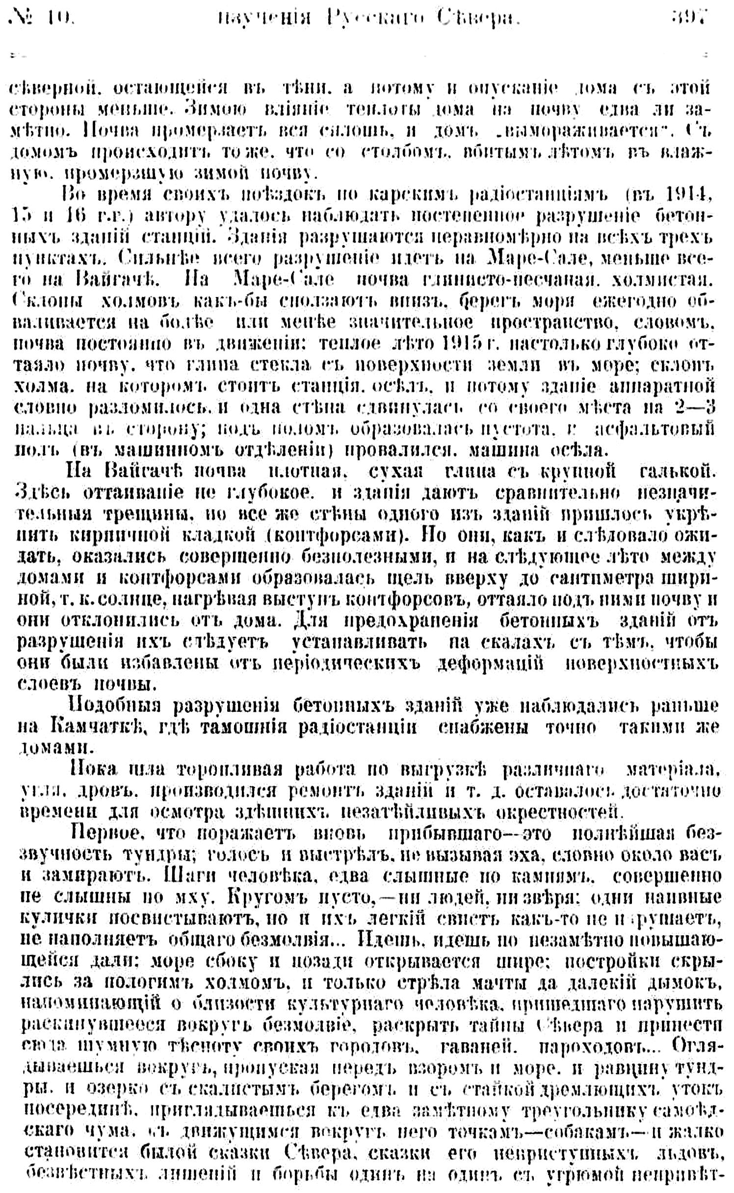 Во время своих поездок по карским радиостанциям (в 1914, 15 и 16 г. г. ) автору удалось наблюдать постепенное разрушение бетонных зданий станций. Здания разрушаются неравномерно на всех трех пунктах. Сильнее всего разрушение идет на Маре-Сале, меньше всего на Вайгаче. На Маре-Сале почва глинисто-песчаная, холмистая. Склоны холмов как-бы сползают вниз, берег моря ежегодно обваливается на более или менее значительное пространство, словом, почва постоянно в движении: теплое лето 1915 г. настолько глубоко оттаяло почву, что глина стекла с поверхности земли в море; склон холма, на котором стоит станция, осел, и потому здание аппаратной словно разломилось, и одна стена сдвинулась со своего места на 2—3 пальца в сторону; под полом образовалась пустота, и асфальтовый пол (в машинном отделении) провалился, машина осела.
