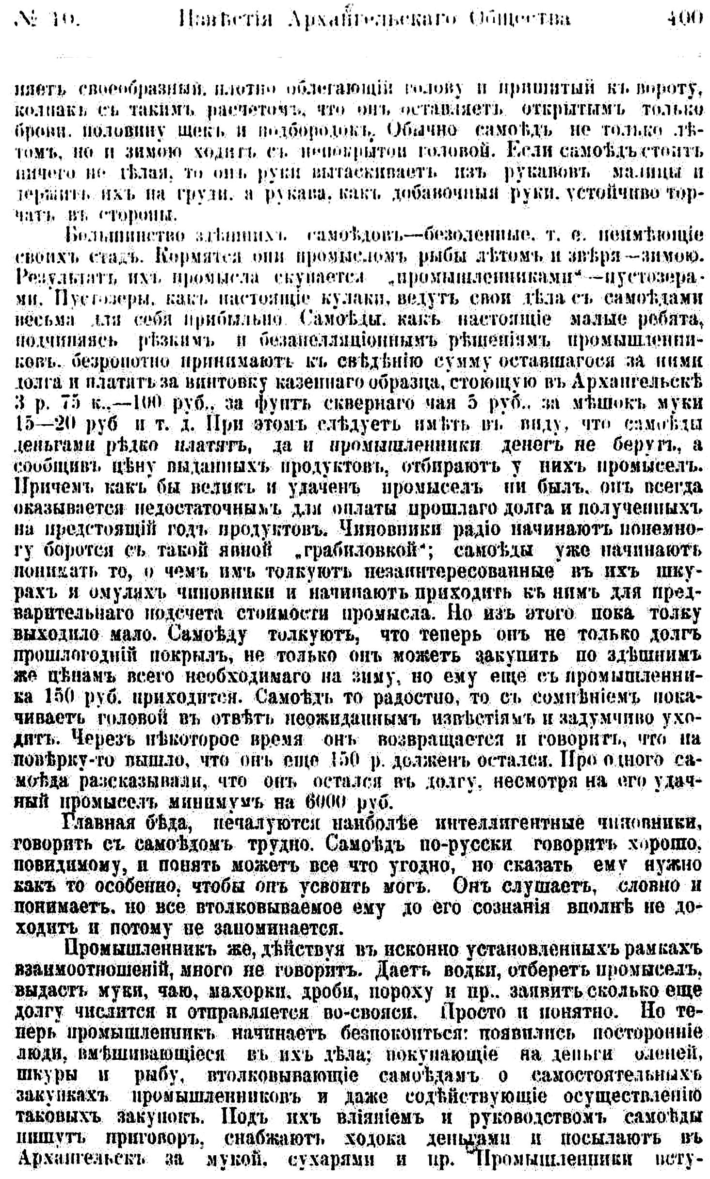 Промышленник же, действуя в исконно установленных рамках взаимоотношений, много не говорит. Даст водки, отберет промысел, выдаст муки, чаю, махорки, дроби, пороху и пр., заявит сколько еще долгу числится и отправляется во-свояси. Просто и понятно. Но теперь промышленник начинает беспокоиться: появились постороннее люди, вмешивающиеся в их дела: покупающие на деньги оленей, шкуры и рыбу, втолковывающие самоедам о самостоятельных закупках промышленников и даже содействующие осуществлению таковых закупок. Под ихъ влиянием и руководством самоеды пишут приговор, снабжают ходока деньгами и посылают в Архангельск за мукой, сухарями и пр. Промышленники всту-