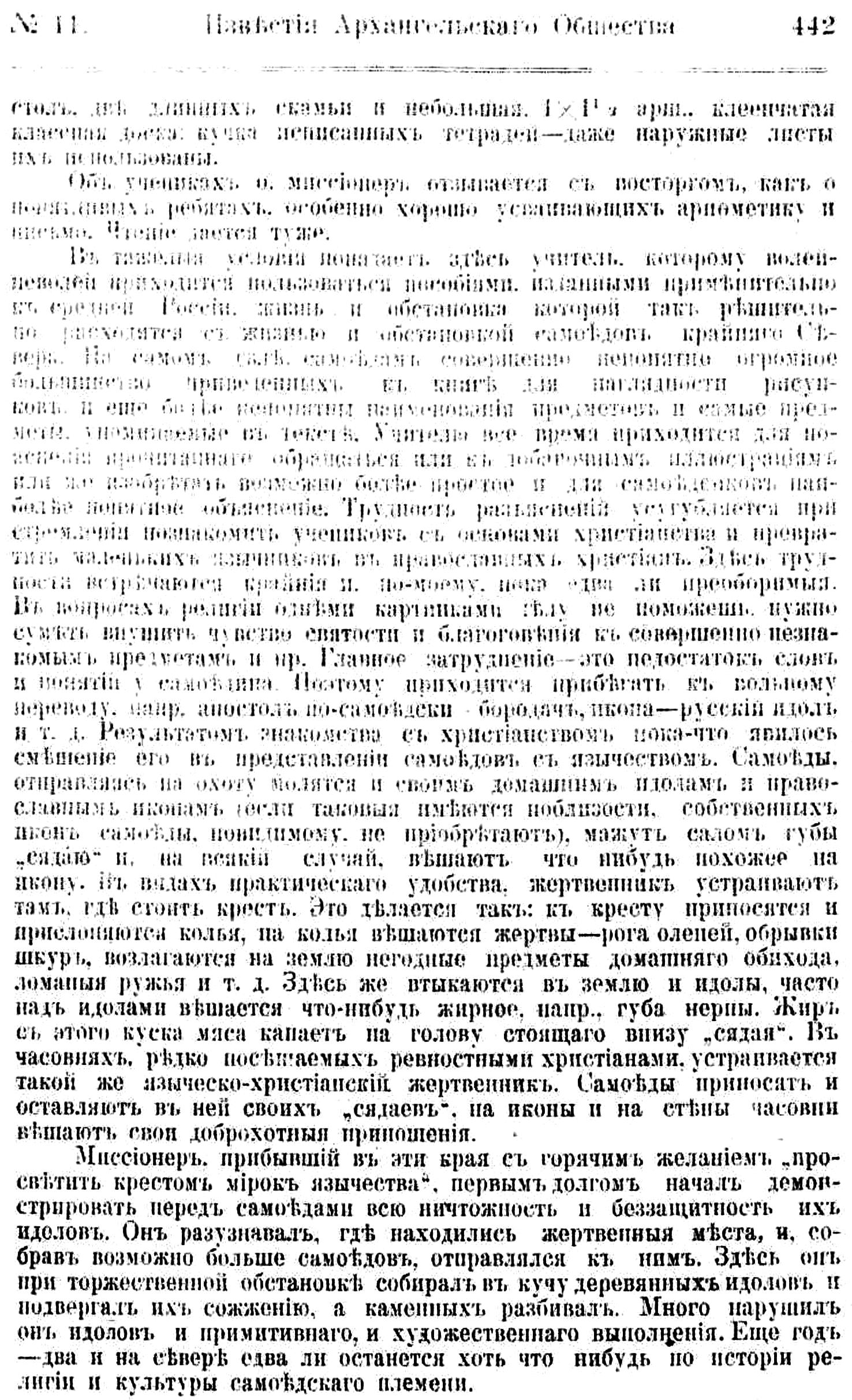 В вопросах религии одними картинками делу не поможешь, нужно суметь внушить чувство святости и благоговения к совершенно незнакомым предметам и пр. Главное затруднение — это недостаток слов и понятий у самоедина. Поэтому приходится прибегать к вольному переводу, напр. апостол по-самоедски бородач, икона— русский идол и т. Результатом закомства с христианством пока-что явилось смешение его в представлении самоедов с язычеством. Самоеды, отправляясь на охоту молятся и своим домашним идолам и православным иконам (если таковые имеются поблизости, собственных икон самоеды, повидимому, не приобретают, мажут салом губы "сядаю" и, на всякий случай, вешают что нибудь похожее на икону, в видах практического удобства, жертвенник устраивают там где стоит крест. Это делается так: к кресту приносятся и прислоняются колья, на колья вешаются жертвы — рога оленей, обрывки шкур, возлагаются на землю негодные предметы домашнего обихода, ломаные ружья и т. д. Здесь же втыкаются в землю и идолы, часто над идолами вешается что-нибудь жирное, напр., губа нерпы. Жир с этого куска мяса капает на голову стоящего внизу "сядая". В часовнях, редко посещаемых ревностными христианами, устраивается такой же языческо-христианский жертвенник. Самоеды приносят и оставляют в ней своих "сядаев", на иконы и на стены часовни вешают свои доброхотные приношения.