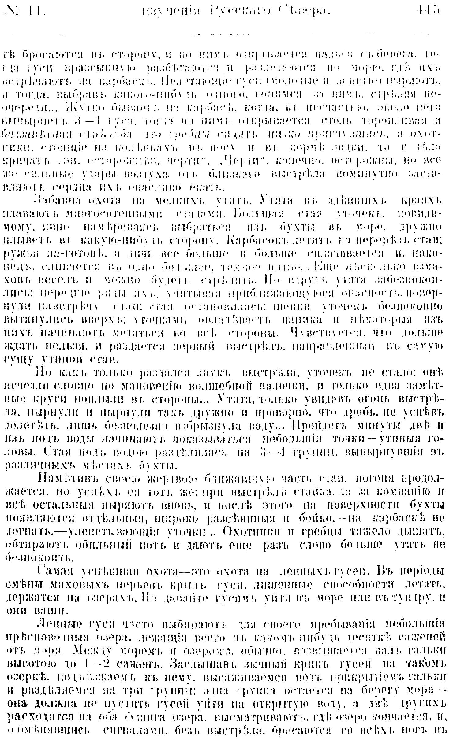те бросаются в сторону, и по ним открывается пальба с берега, когда гyси врассыпную разбегаются и разлетаются по морю, где их встречают нa карбасе. Нелетающие гуси молодые и ленные ныряют, и тогда, выбрав какого-нибудь одного, гонимся за ним, стреляя поочередно... Жутко бывало на карбасе, когда, к несчастью около него вынырнент 3—4 гуся, тогда по ним открывается столь торопливая и бесзаветтная стрельба что гребцы сидят низко пригнувшись, a охотники, стоящие на коленках в носу и в корме лодки, то и дело кричат " эй осторожнее черти". „Черти", конечно, осторожны, но все же сильные удары воздуха от близкого выстрела поминутно заставляют сердца их опасливо екать.