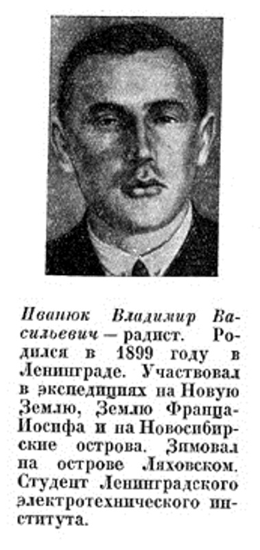 Иванюк Владимир Васильевич — радист. Родился в 1899 году в Ленинграде. Участвовал в экспедициях на Новую Землю, Землю Франца-Иосифа и на Новосибирские острова. Зимовал на острове Ляховском. Студент Ленинградского Электротехнического института.