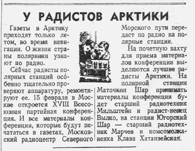 Газеты в Арктику приходят только летом, во время навигации.О жизни страны полярники узнают по радио.Сейчас радисты полярных станций особенно тщательно проверяют аппаратуру, ремонтируют ее. 15 февраля в Москве откроется XVIII Всесоюзная партийная конференция.