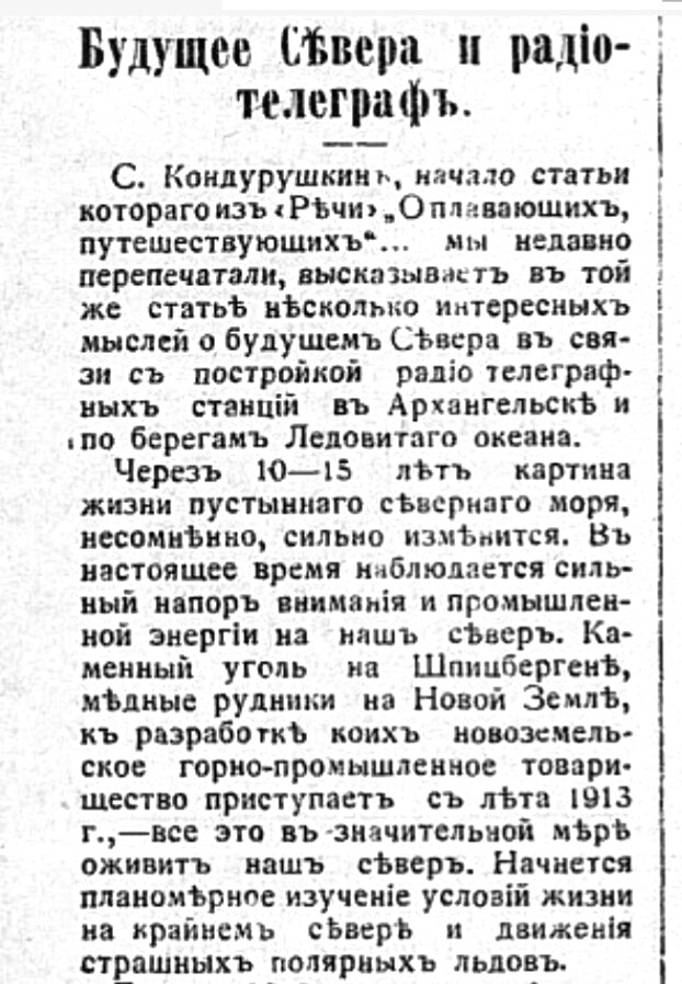 Кондурушкин С.Будущее Севера и радиотелеграф//Архангельскъ №131 14 июня 1913