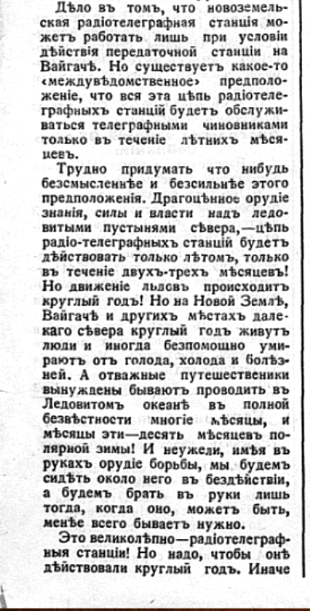 Поэтому в 1911 г. В.А. Русанов высказал мысль о необходимости сооружения маяков и наблюдательных постов, снабженных радиопередатчиками, на Новой Земле, а также на островах Вайгаче и Белом, то есть на значительной части Северного морского пути — от Белого моря до устья Оби.