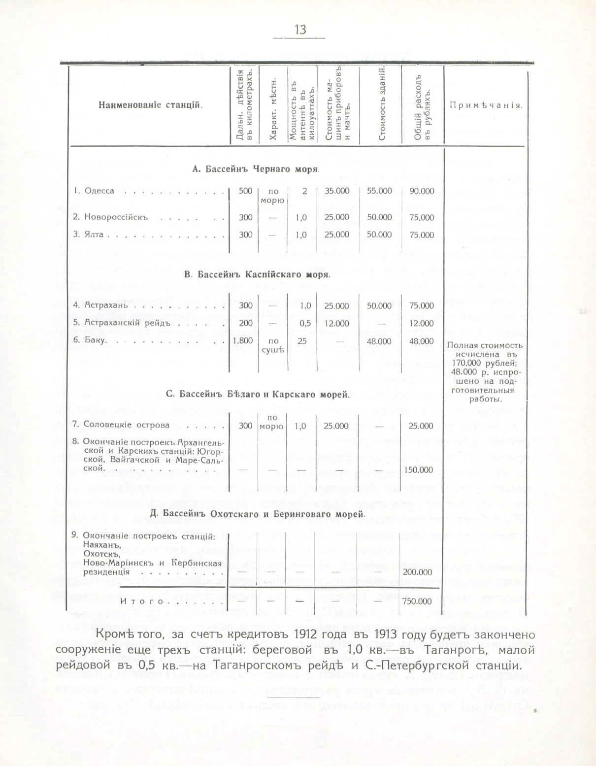 Въ 1913 году Главное Управленіе почтъ и телеграфов продолжает работы по оборудованію внутренних и внѣшних бассейнов Имперіи береговыми станціями. На означенный предмет в 1913 году испрашивается кредит в 750.000 руб., за счет котораго по смѣтѣ предположено осуществить нижеслѣдующую строительную программу.