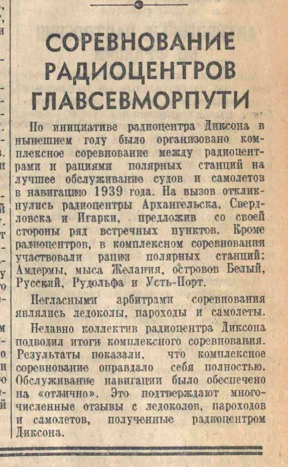 Соревнование радиоцентров Главсевморпути //Комсомольская правда 4 декабря 1939 №277