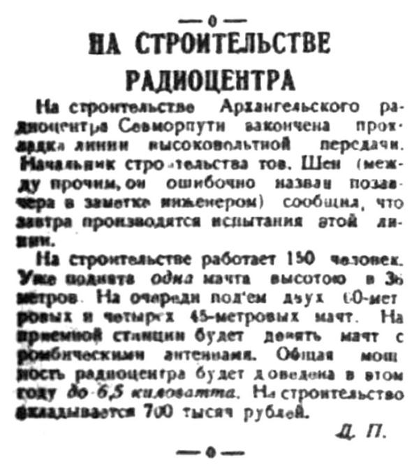 Строительство Архангельского радиоцентра Главсевморпути идет быстрыми темпами. На стройке приемной станции сооружены главное здание и два жилых дома. Начался монтаж аппаратуры. Вчера и позавчера производилась установка мачт для антенн. Подняты мачты высотою в 36 метров. Руководит строительством инженер тов. Шен.