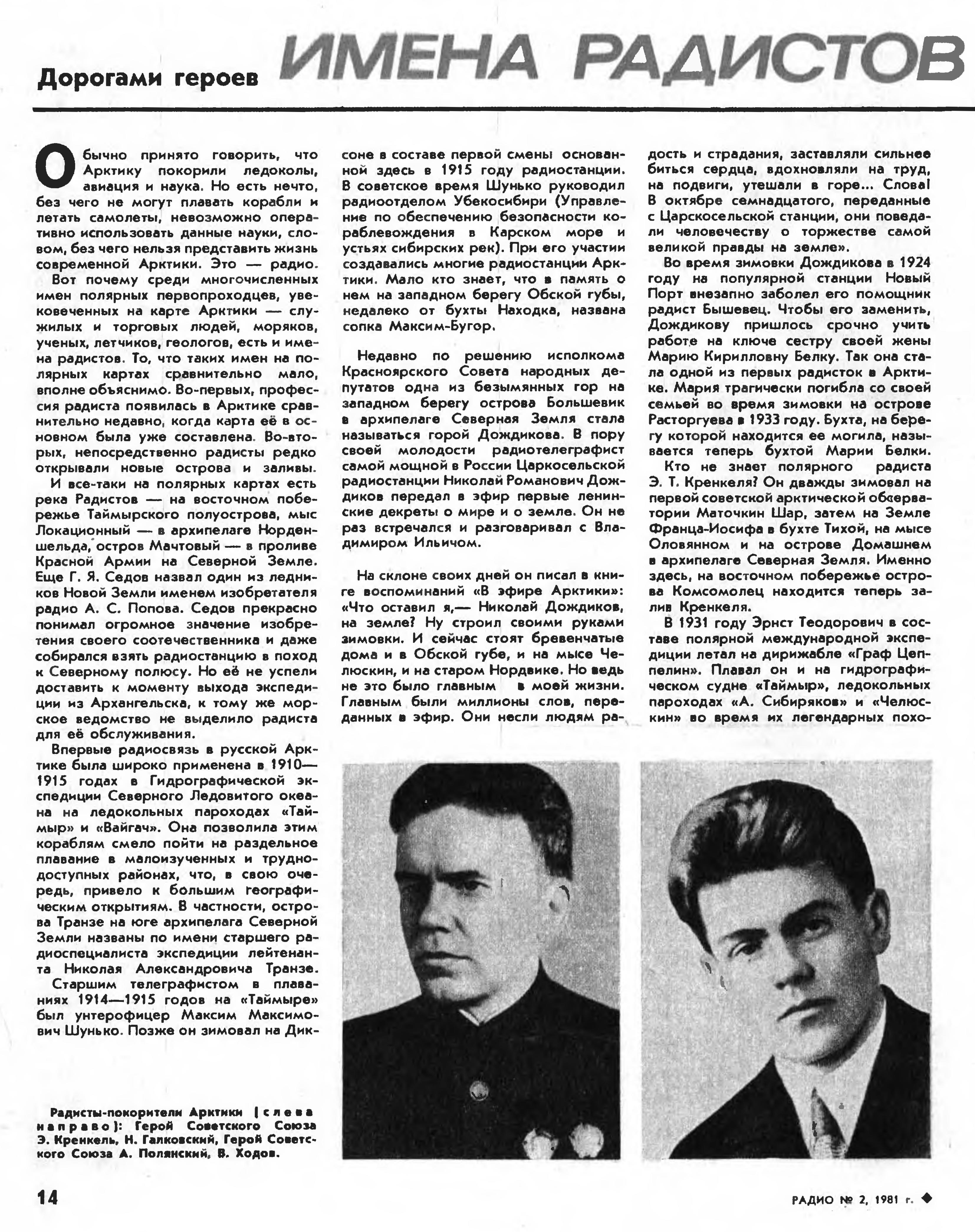 Вот почему среди многочисленных имен полярных первопроходцев, увековеченных на карте Арктики — служилых и торговых людей, моряков, ученых, летчиков, геологов, есть и имена радистов. То, что таких имен на полярных картах сравнительно мало, вполне объяснимо. Во-первых, профессия радиста появилась в Арктике сравнительно недавно, когда карта её в основном была уже составлена. Во-вторых, непосредственно радисты редко открывали новые острова и заливы.
