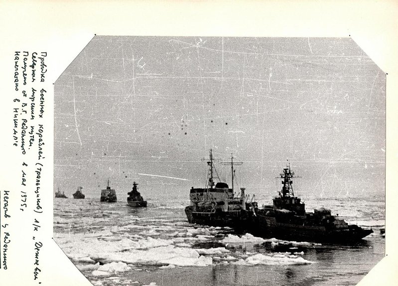 8 и 9 июля шли в восточной части Баренцева моря. Моросящий дождь и туман. Видимость 1-2 кабельтова. Вечером вошли в пролив Карские ворота. В конце суток вышли из пролива в Карское море и сразу же начали маневрирование в битом серо-белом льду при обеспечении ледоколов «Ленин», «Ермак» и «Капитан Белоусов». Несмотря на проводку за ледоколами непрерывно контролируем своё место. Видимости – никакой. Впереди идущего не видно, ориентируемся по радиолокации и замерам глубин, вокруг сплошной гул туманных сигналов. На некоторое время туман рассеивается до видимости 3-4 кабельтова. Выходим на чистую воду, затем опять входим в лёд, и снова туман. В общем, не плавание, а сплошная трёпка нервов.