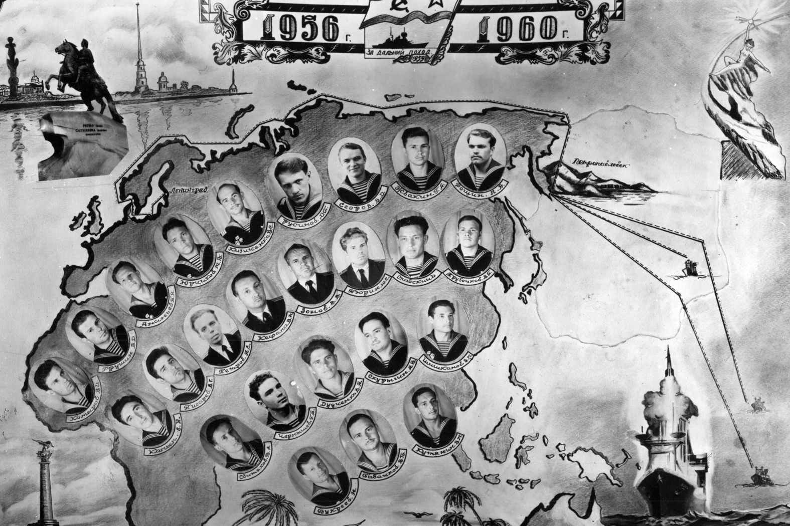 Тихий океан «на работу», в свой первый боевой поход (на снимке слева - командир "Сахалина" капитан 1 ранга В.В.Зонов (справа) с капитаном 2 ранга Н.Ф.Марухиным в рубке, 1961 г.; на снимке справа - коллективное фото матросов экипажа "Сахалина" первого призыва 1956-1960 гг.)