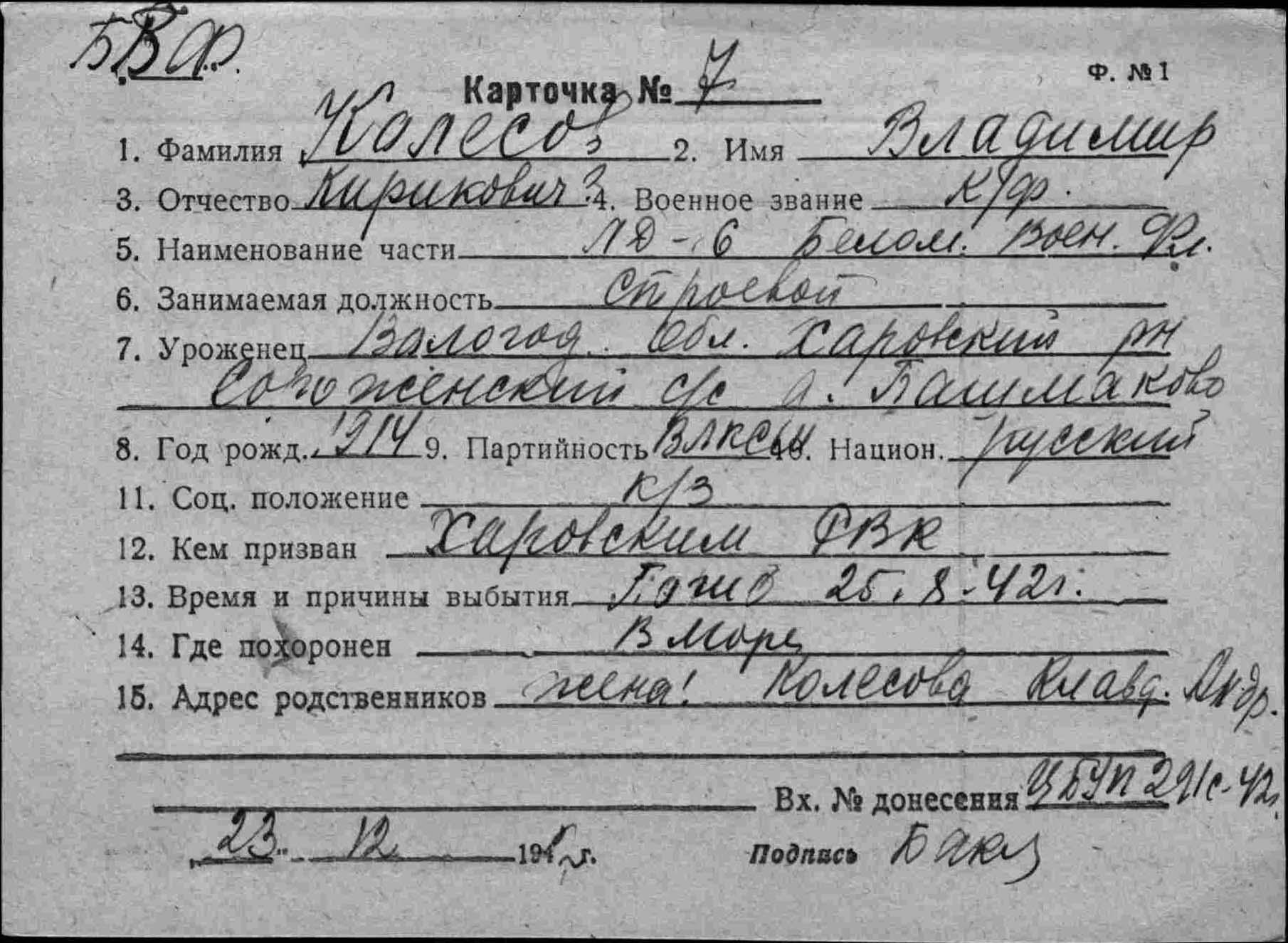 Дата и место призыва __.__.1941 Харовский РВК, Вологодская обл., Харовский р-н