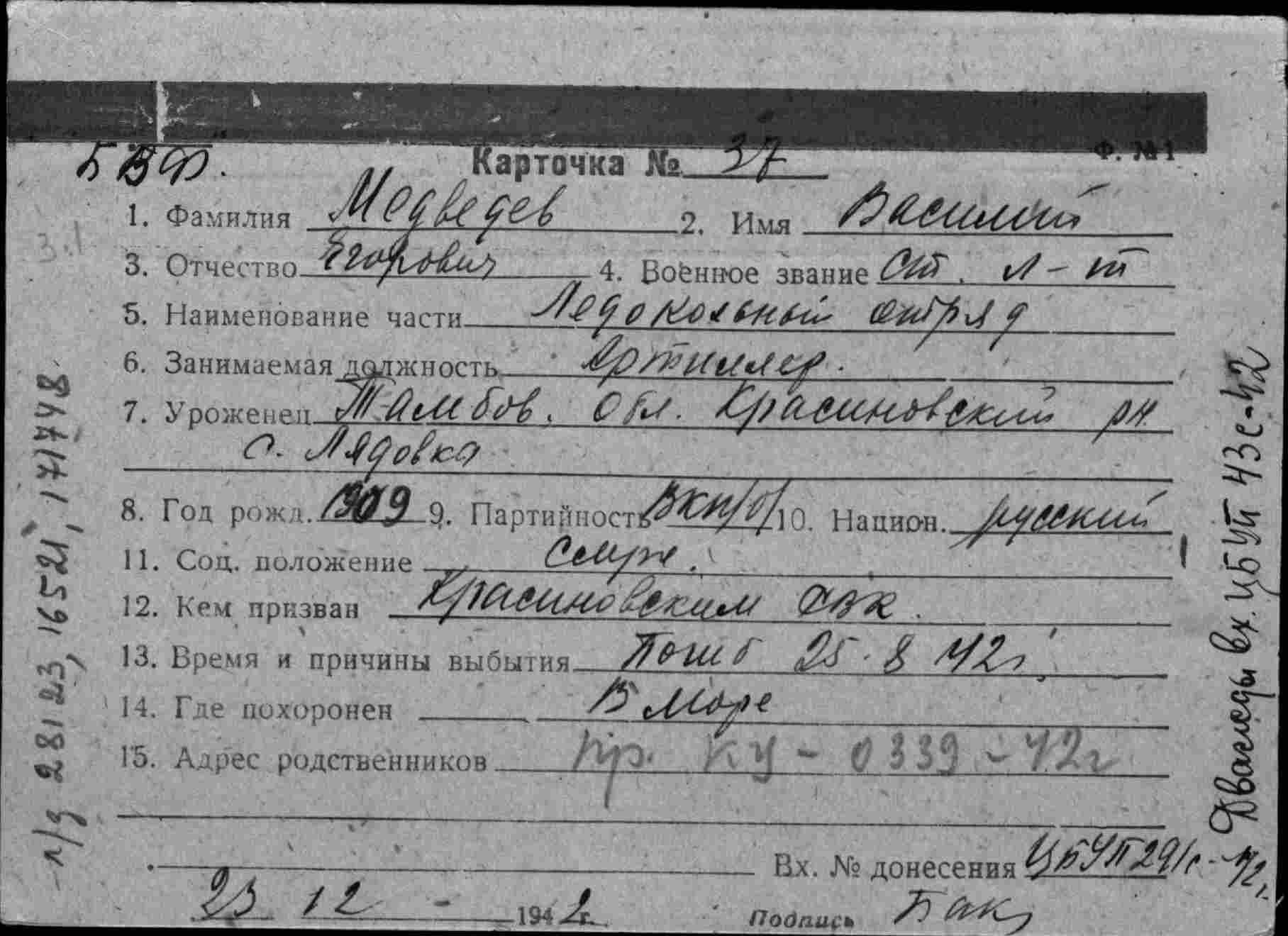 Дата и место призыва __.__.1933 Красивский РВК, Тамбовская обл., Красивский р-н