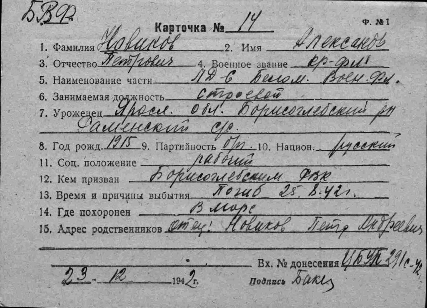 Дата и место призыва __.__.1941 Борисоглебский РВК, Ярославская обл., Борисоглебский р-н