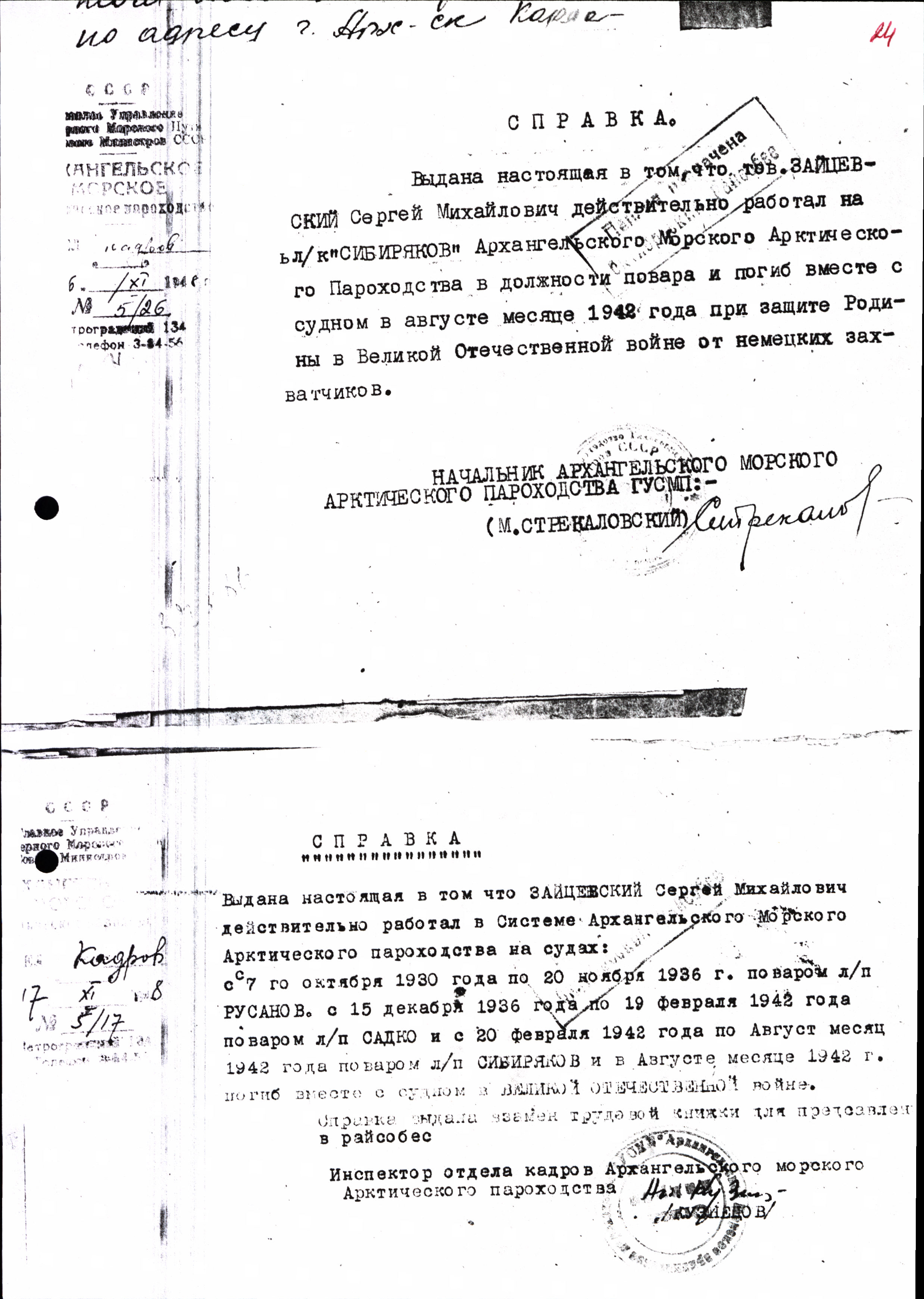 36. Зайцевский Сергей Михайлович, дата рождения – 18.08.1905 г. (1895 г.); место рождения – г. Архангельск; должность (специальность) – повар, л/п «А. Сибиряков» (ЛД-6); места работы – с 07.10.1930 г. по 20.11.1936 г. повар на л/п «Русанов», с 15.12.1936 г. по 19.02.1942 г. повар на л/п «Садко», с 20.02.1942 г. повар на л/п «А. Сибиряков»; по какой причине, где и когда выбыл – умер в плену 02.09.1942 г., шталаг 330, в Нарвике, имел ожоги 1-3 степеней головы, ягодиц, икр, бедер, токсикоз, сердечную недостаточность, 03.09.1942 г. похоронен в лагерном кладбища в Нарвике (умер в Польше, г. Гдыня; погиб вместе с кораблем в августе 1942 г.); дополнительная информация – прибыл в Нарвик 31.08.1942 г.; источник информации – ЦВМА, ЦАМО, ГААО.
