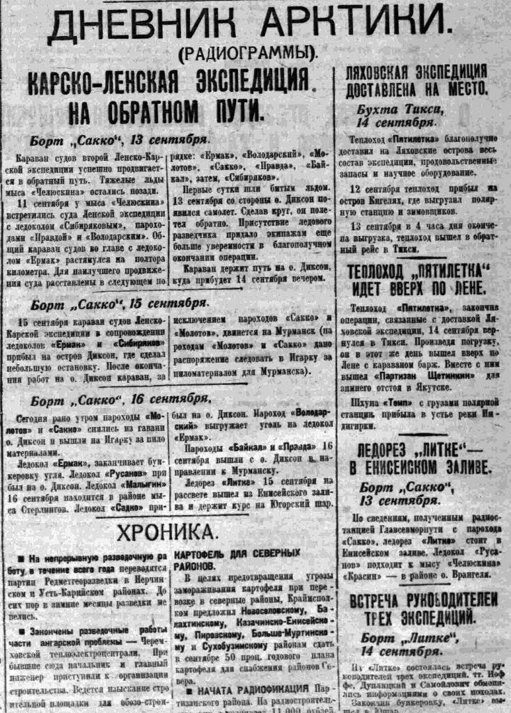 ЛЕДОРЕЗ "ЛИТКЕ" — В ЕНИСЕЙСКОМ ЗАЛИВЕ.Борт "Сакко", 13 сентября.По сведениям, полненным радиостанцией Главсевморпути с парохода «Сакко», ледорез «Литке» стоит в Енисейском заливе. Ледокол «Русанов» подходит к мысу «Челюскина», «Красин» — в районе о. Врангеля.