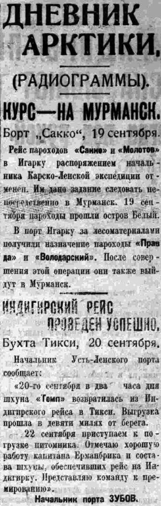 13 сентября в 4 часа дня окончена выгрузка, теплоход вышел в обратный рейс в Тикси.