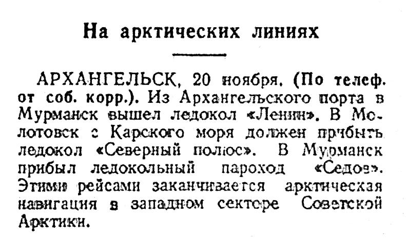 АРХАНГЕЛЬСК, 20 ноября, (По телеф. от соб. корр.). Из Архангельского порта в Мурманск вышел ледокол «Ленин». В Молотовск с Карского моря должен прибыть ледокол «Северный полюс». В Мурманск прибыл ледокольный пароход «Седов». Этими рейсами заканчивается арктическая навигация в западном секторе Советской Арктики.