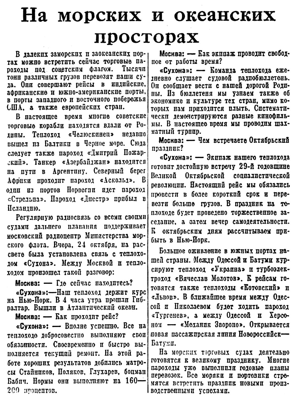 «Сухона»: — Экипаж нашего теплохода готовит достойную встречу 29-й годовщине Великой Октябрьской социалистической революции. Настоящий рейс мы обязались провести в более короткий срок и перевезти больше грузов. В праздник на теплоходе будет проведено торжественное заседание, а затем вечер самодеятельности. К октябрьским дням рассчитываем прибыть в Нью-Йорк.