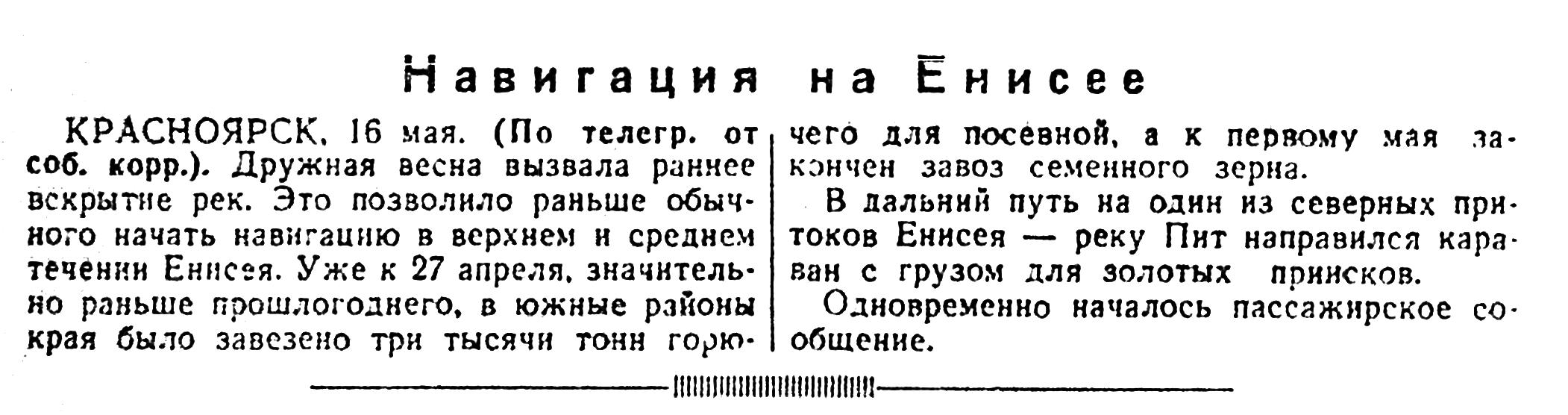 КРАСНОЯРСК. 16 мая. (По телегр. от соб. корр.). Дружная весна вызвала раннее вскрытие рек. Это позволило раньше обычного начать навигацию в верхнем и среднем течении Енисея. Уже к 27 апреля, значительно раньше прошлогоднего, в южные районы края было завезено три тысячи тонн горючего для посевной, а к первому мая закончен завоз семенного зерна.