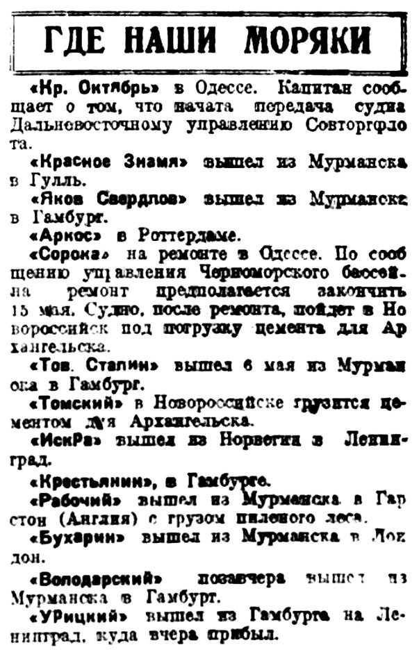 Наркомвод предписал немедленно оказать помощь затертым во льдах людям. Вчера по распоряжению находящегося в Архангельске зам. Наркомвода тов. Розенталь снят с зверобойных промыслов ледокол «Малыгин»» и направляется к Новой Земле.