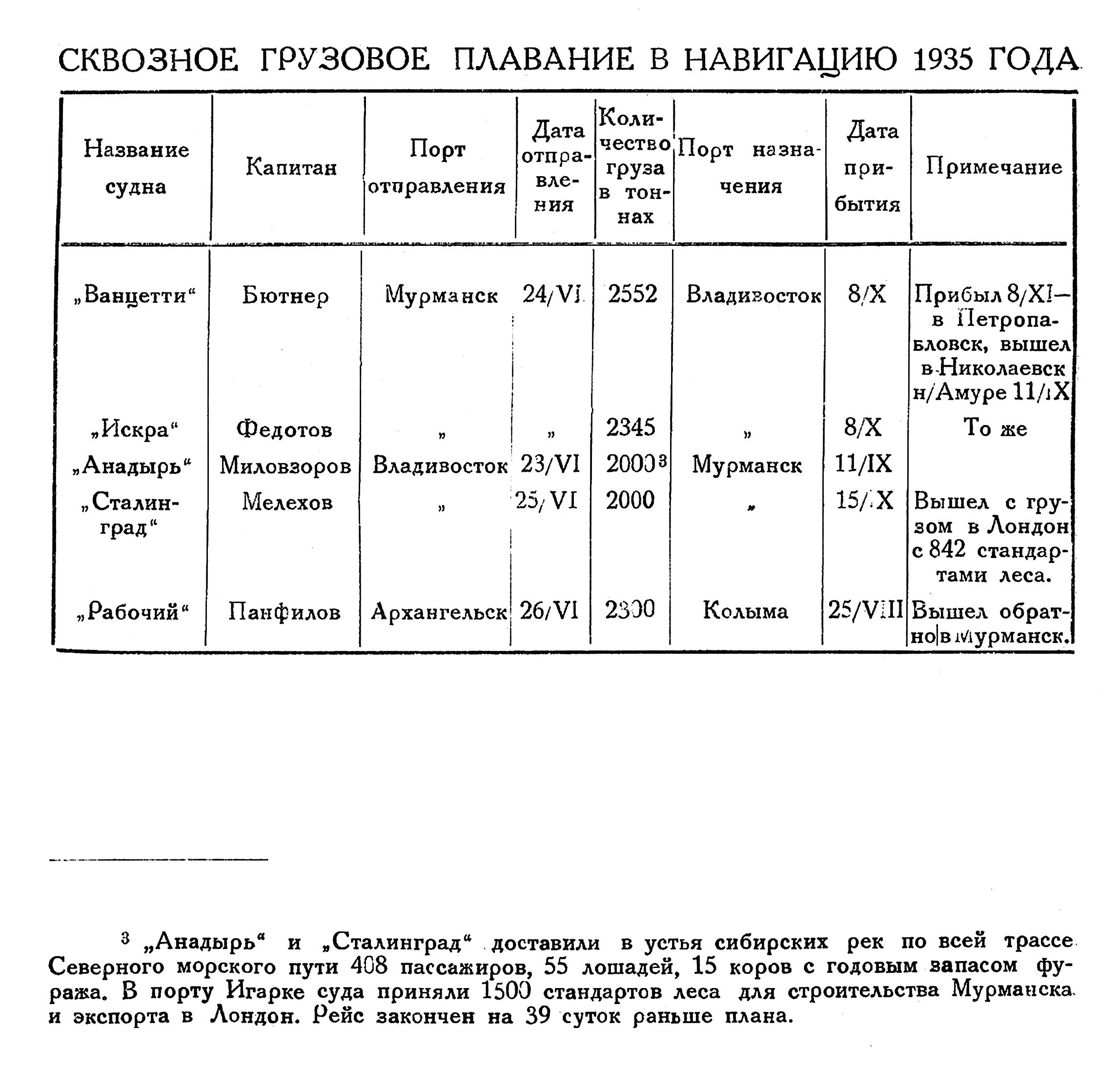 Впервые в истории мореплавания проведены важнейшие сквозные рейсы на обычных грузовых пароходах „Анадырь" и „Сталинград" — из Владивостока в Мурманск и на пароходах „Ванцетти" и „Искра" — из Мурманска во Владивосток. Особо выделяется рейс парохода „Рабочий" из Архангельска в устье реки Колымы с возвращением в Архангельск, позволивший резко удешевить колымские грузы и в пять раз сократить их пробег.