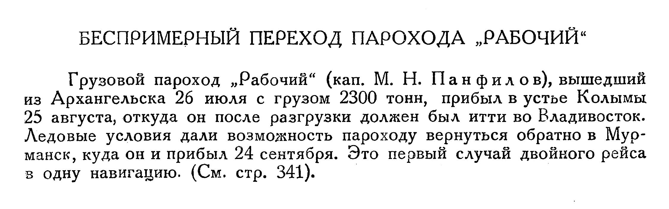 Грузовой пароход "Рабочий" (кап. М. Н. Панфилов), вышедший из Архангельска 26 июля с грузом 2300 тонн, прибыл в устье Колымы 25 августа, откуда он после разгрузки должен был итти во Владивосток. Ледовые условия дали возможность пароходу вернуться обратно в Мурманск, куда он и прибыл 24 сентября. Это первый случай двойного рейса в одну навигацию. (См. стр. 341).