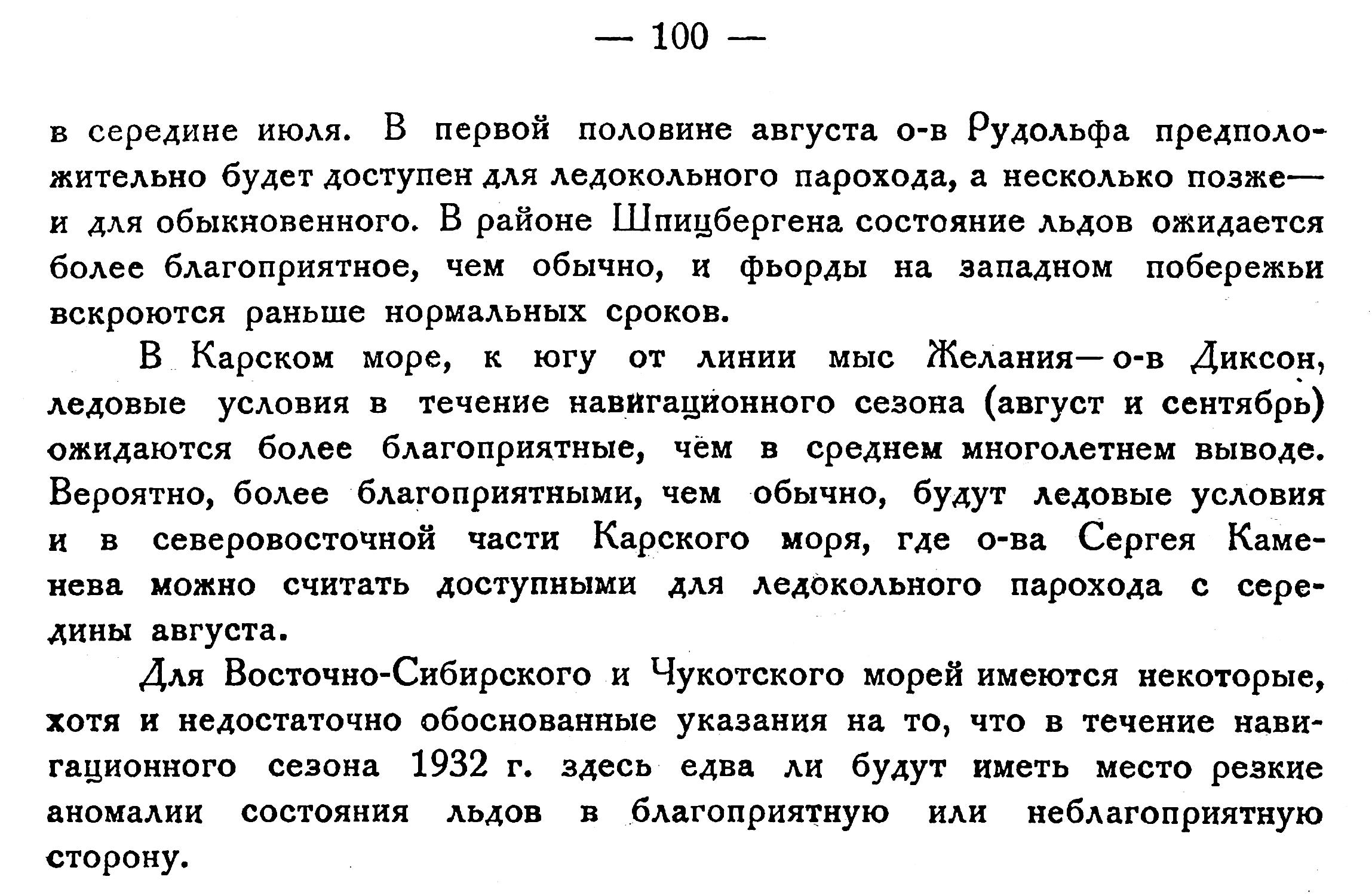 Для Восточно-Сибирского и Чукотского морей имеются некоторые, хотя и недостаточно обоснованные указания на то, что в течение навигационного сезона 1932 г. здесь едва ли будут иметь место резкие аномалии состояния льдов в благоприятную или неблагоприятную сторону.