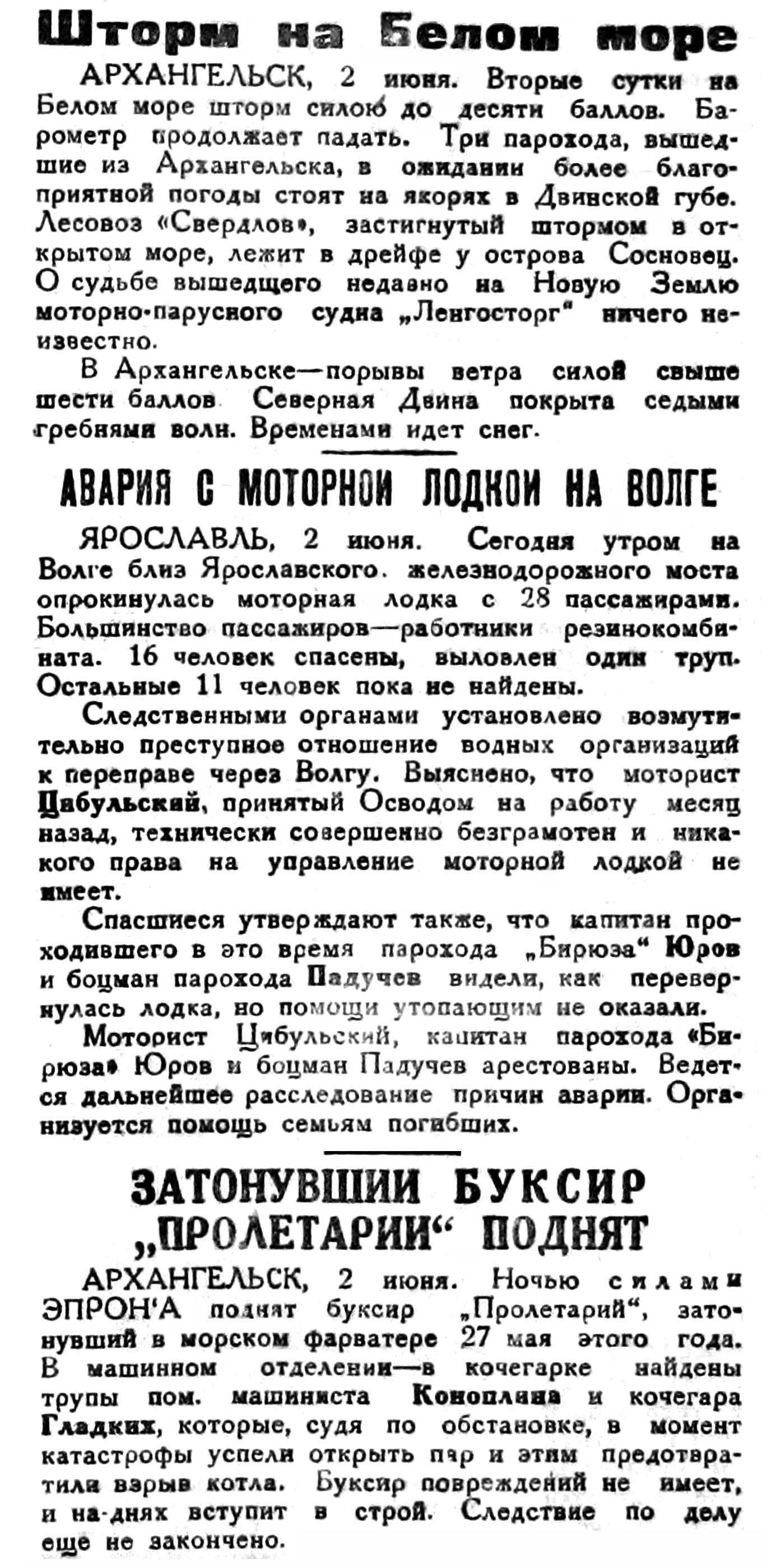 Следственными органами установлено возмутительно преступное отношение водных организаций к переправе через Волгу. Выяснено, что моторист Цибульский, принятый Осводом на работу месяц назад, технически совершенно безграмотен и никакого права на управление моторной лодкой не имеет.