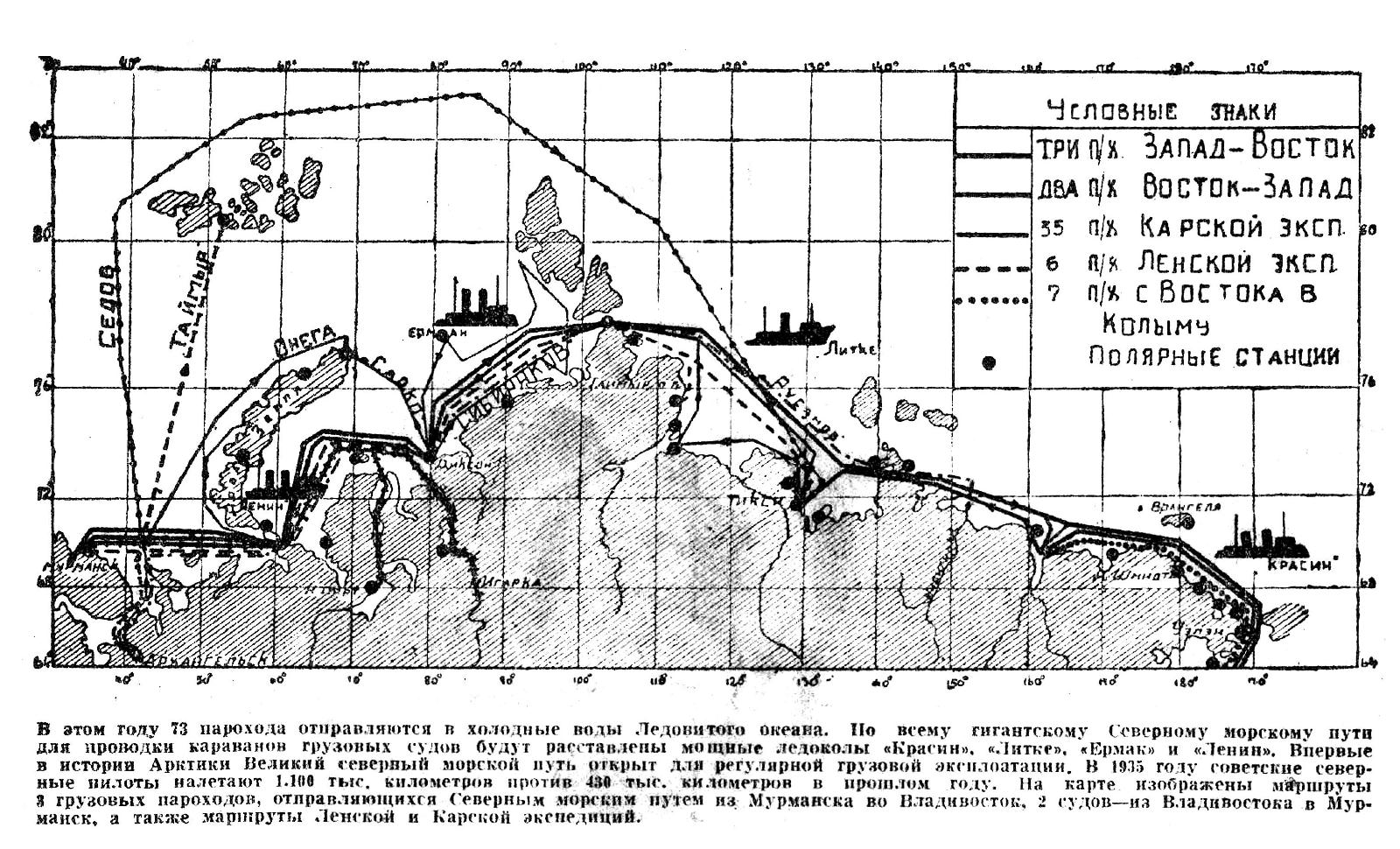 В этом году 73 парохода отправляются в холодные воды Ледовитого океана. Но всему гигантскому Северному морскому пути для проводки караванов грузовых судов будут расставлены мощные ледоколы «Красин», «Литке», «Ермак» и «Ленин». Впервые в истории Арктики Великий северный морской путь открыт для регулярной грузовой эксплоатации. В 1935 году советские северные пилоты налетают 1.100 тыс. Километров против 430 тыс. километров в прошлом году. На карте изображены маршруты 3 грузовых пароходов, отправляющихся Северным морским путем из Мурманска во Владивосток, 2 судов — из Владивостока в Мурманск, а также маршруты Ленской и Карской экспедиций.