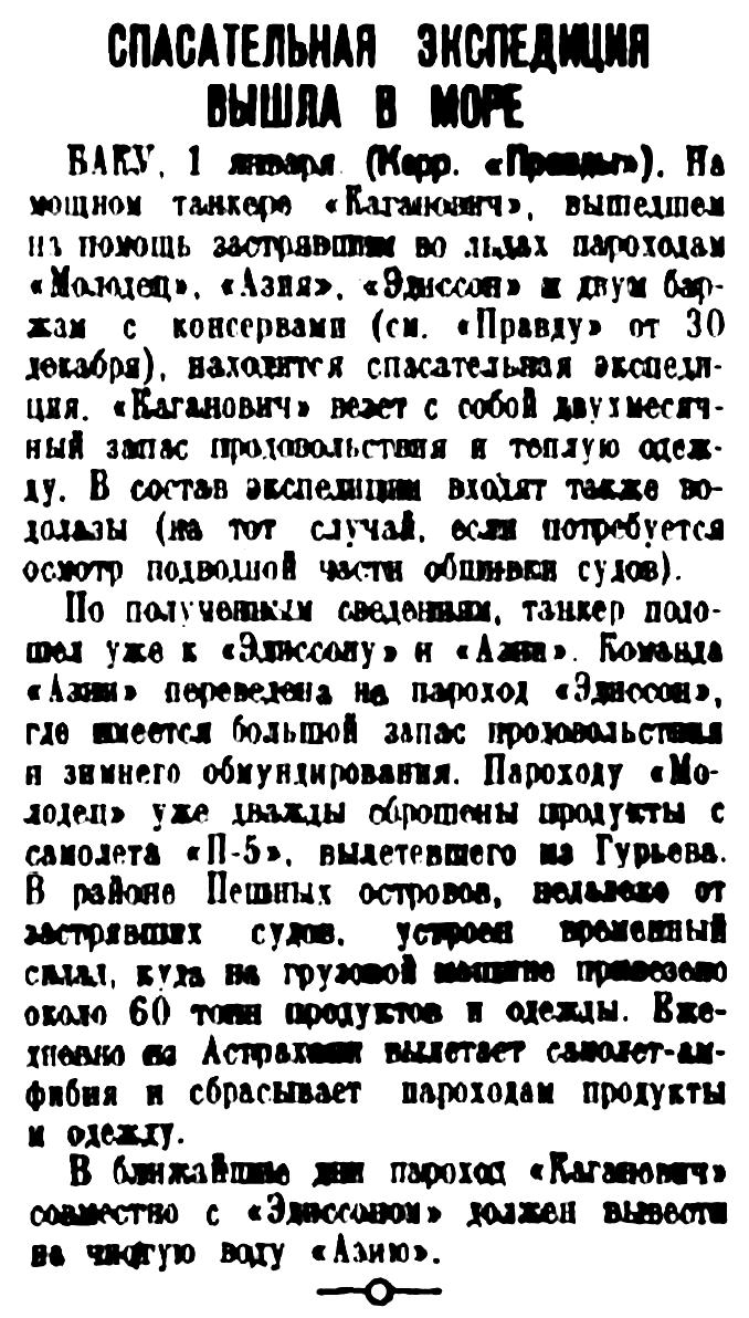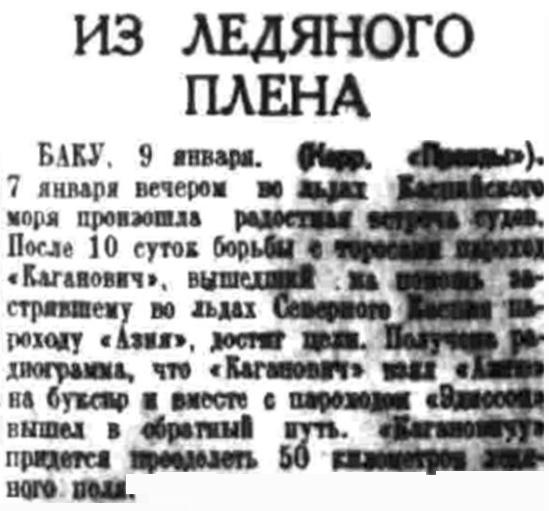 7 января вечером во льдах Каспийского моря произошла радостная встреча судов. После 10 суток борьбы с торосами пароход "Каганович", вышедший на помощь застрявшему во льдах Северного Каспия пароходу "Азия", достиг цели. Получена радиограмма, что "Каганович" взял "Азию" на буксир и вместе с пароходом "Эдиссон" вышел в обратный путь. "Кагановичу" придется преодолеть 50 километров ледового поля.