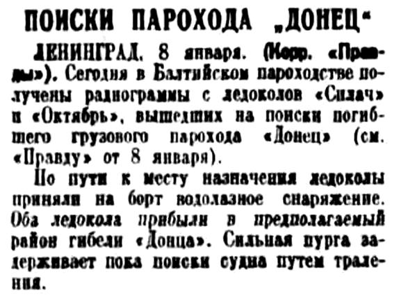 ЛЕНИНГРАД. 8 января. (Корр. "Правды"). Сегодня в Балтийском пароходстве получены радиограммы с ледоколов "Силач" и "Октябрь", вышедших на поиски погибшего грузового парохода "Донец" (см. "Правду" от 8 января).