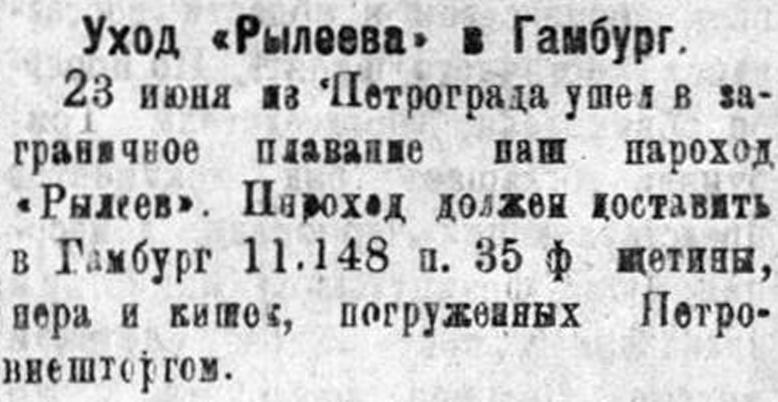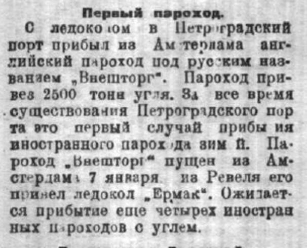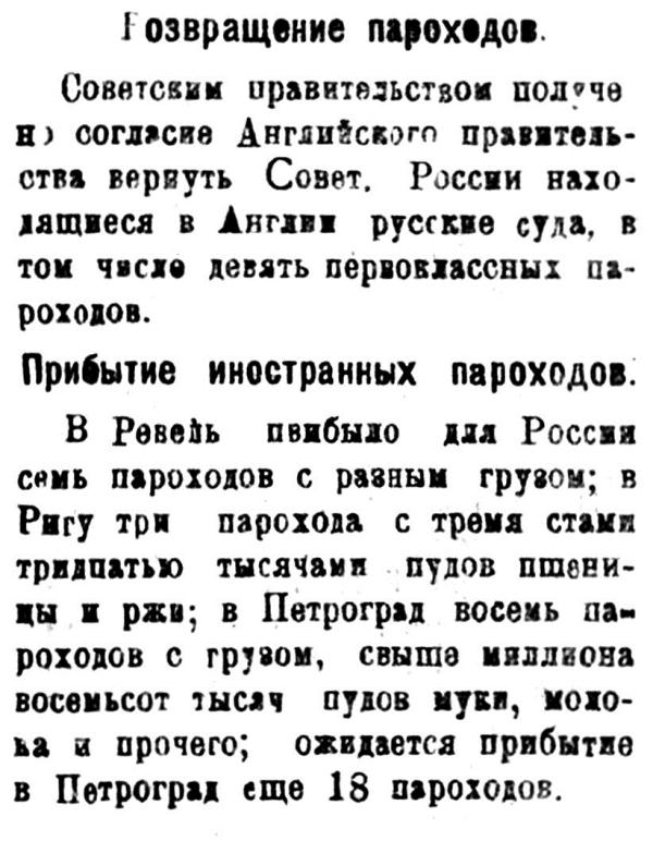 В Ревель прибыло для России семь пароходов с разным грузом; в Ригу три парохода с тремя стами тридцатью тысячами пудов пшеницы и ржи; в Петроград восемь пароходов с грузом, свыше миллиона восемьсот тысяч пудов муки, молока и прочего; ожидается прибытие в Петроград еще 18 пароходов.