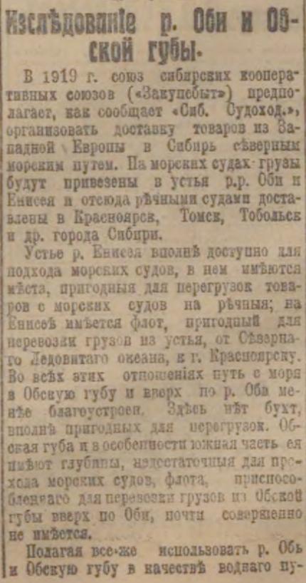 В 1919 г. союз сибирских кооперативных союзов («Закупcбыт») предполагает, как сообщает «Сиб. Судоход.» организовать доставку товаров из Западной Европы в Сибирь северным морским путем. На морских судах грузы будут привезены в устья р.р. Оби и Енисея и отсюда речными судами доставлены в Красноярск, Томск, Тобольск и др. города Сибири.