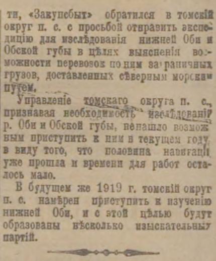В будущем же 1919 г. томский округ п. с. намерен приступить к изучению нижней Оби, и с этой целью будут образованы несколько изыскательных партий.
