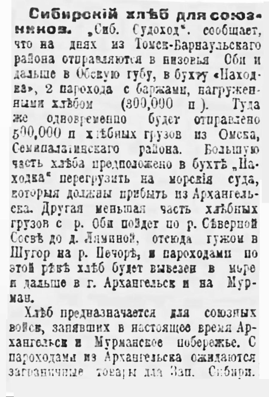 Сибирский хлеб для союзников. "Сиб. Судоход", сообщает, что на днях из Томск-Барнаульского района отправляются в низовья Оби и дальше в Обскую губу, в бухту «Находка», 2 парохода с баржами, нагруженными хлебом (300,000 п). Туда же одновременно будет отправлено 500,000 п хлебных грузов из Омска, Семипалатинского района. Большую часть хлеба предположено в бухте "Находка" перегрузить на морские суда, которые должны прибыть из Архангельска. Другая меньшая часть хлебных грузов с р. Оби пойдет по р. Северной Сосьве до д. Ляминой, отсюда гужом в Щугор на р. Печоре, и пароходами по этой реке хлеб будет вывезен в море и дальше в г. Архангельск и на Мурман.