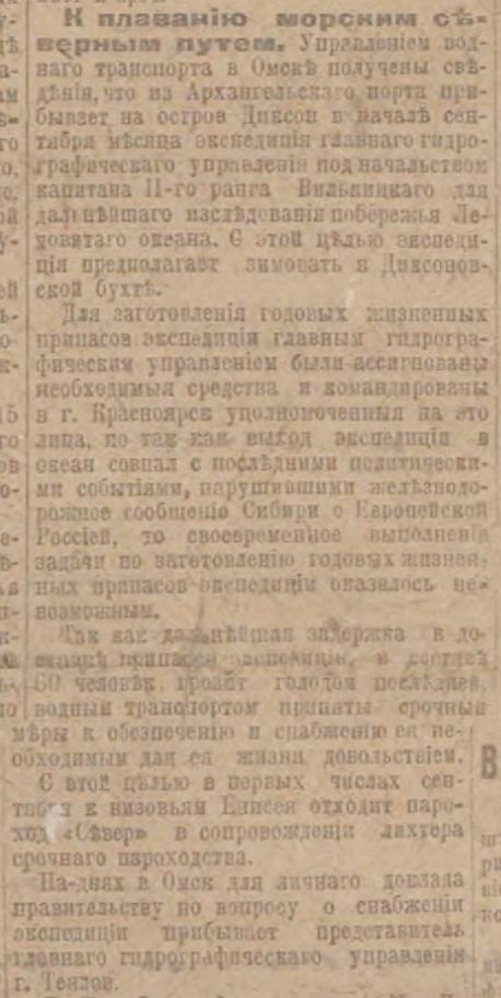 К плаванию морским северным путем. Управлением водного транспорта в Омске получены сведения, что из Архангельского порта прибывает на остров Диксон в начале сентября месяца экспедиция главного гидрографического управления под начальством капитана II-го ранга Вилькицкого для дальнейшего исследования побережья Ледовитого океана. С этой целью экспедиция предполагает зимовать в Диксоновской бухте.