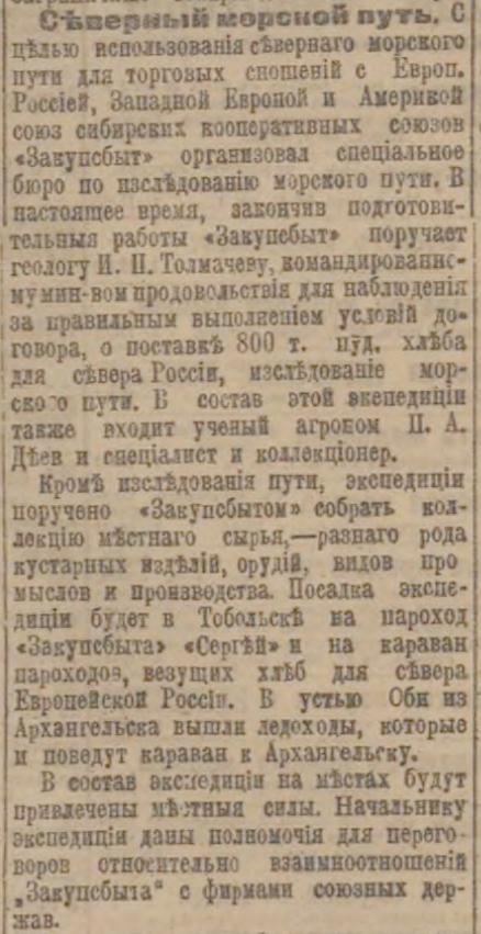 Северный морской путь. С целью использования северного морского пути для торговых сношений с Европой. Россией, Западной Европой и Америкой союз сибирских кооперативных союзов «Закупсбыт» организовал специальное бюро по исследованию морского пути. В настоящее время, закончив подготовительные работы «Закупсбыт» поручает геологу И. П. Толмачеву, командирование с минимумом продовольствия для наблюдения за правильным выполнением условий договора, о поставке 800 т. пуд. хлеба для севера России, исследование морского пути. В состав этой экспедиции также входит ученый агроном П. А. Деев и специалист и коллекционер.