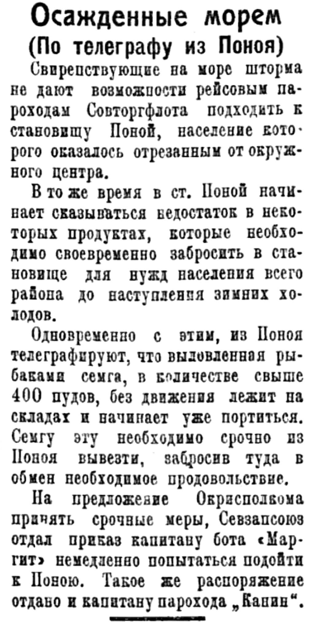 С 25-го октября начинается зимняя навигация; один из рейсовых пароходов Совторгфлота будет курсировать по Западному побережью (до Вардэ ) и по Восточному побережью (до Иоканьги).