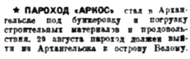 ПАРОХОД "АРКОС" стал в Архангельске под бункеровку и погрузку строительных материалов и продовольствия. 29 августа пароход должен выйти из Архангельска к острову Белому.