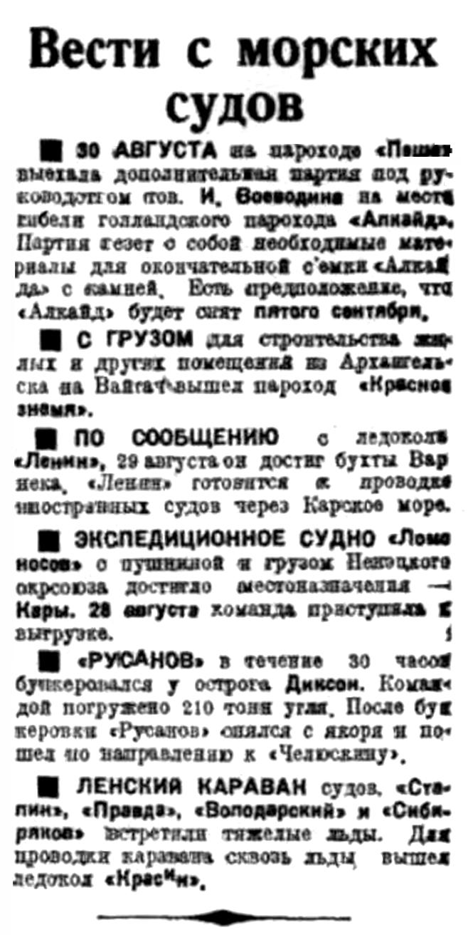 30 АВГУСТА на пароходе "Пеша" выехала дополнительная партия под руководством тов. И. Воеводина на место гибели голландского парохода "Алкайд". Партия везет с собой необходимые материалы для окончательной съемки "Алкайда" с камней. Есть предположение, что "Алкайд" будет снят пятого сентября.