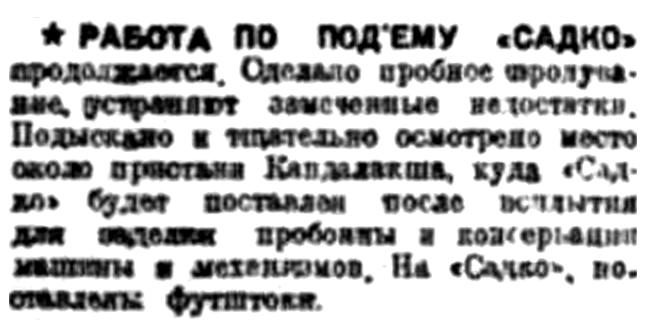 РАБОТА ПО ПОДЪЕМУ «САДКО» продолжается. Сделано пробное продувание, устраняют замеченные недостатки. Подыскано и тщательно осмотрено место около пристани Кандалакши, куда "Садко" будет поставлен после всплытиям для заделки пробоин и консервации машины и механизмов. На "Садко" поставлены футштоки.