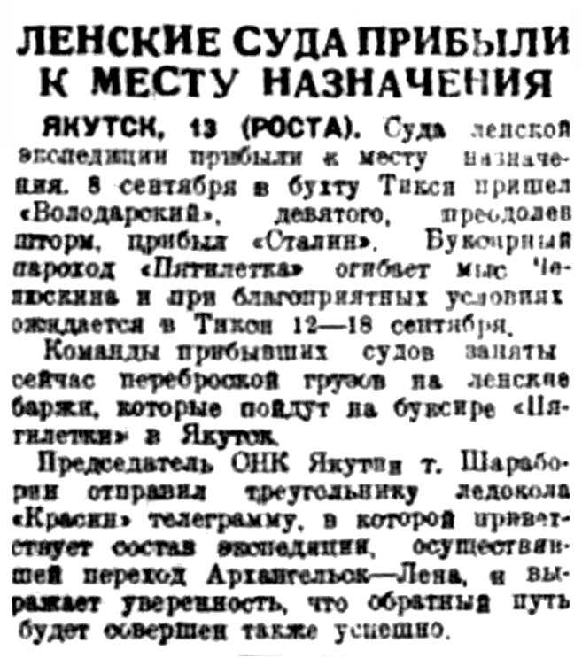 ЯКУТСК, 11 (РОСТА). Суда ленской экспедиции прибыли к месту назначения. 8 сентября в бухту Тикси пришел "Володарский", девятого, преодолев шторм, прибыл "Сталин". Буксирный пароход "Пятилетка" огибает мыс Челюскина и при благоприятных условиях ожидается в Тикси 12—18 сентября.