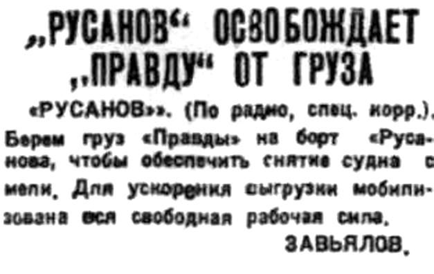 «РУСАНОВ». (По радио, спец. корр. ). Берем груз «Правды» на борт «Русанова», чтобы обеспечитъ снятие судна с мели. Для ускорения выгрузки мобилизована вся свободная рабочая сила.