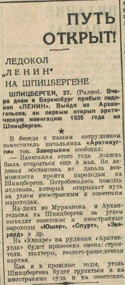 Навигация 1935 г., проведенная на судах нормального типа, без аварий, в короткие сроки, безоговорочно подтвердила правильность решения партии и правительства—включить Северный морской путь в систему путей сообщения СССР. Этот путь наиболее короткий и проходит полностью в советских водах.