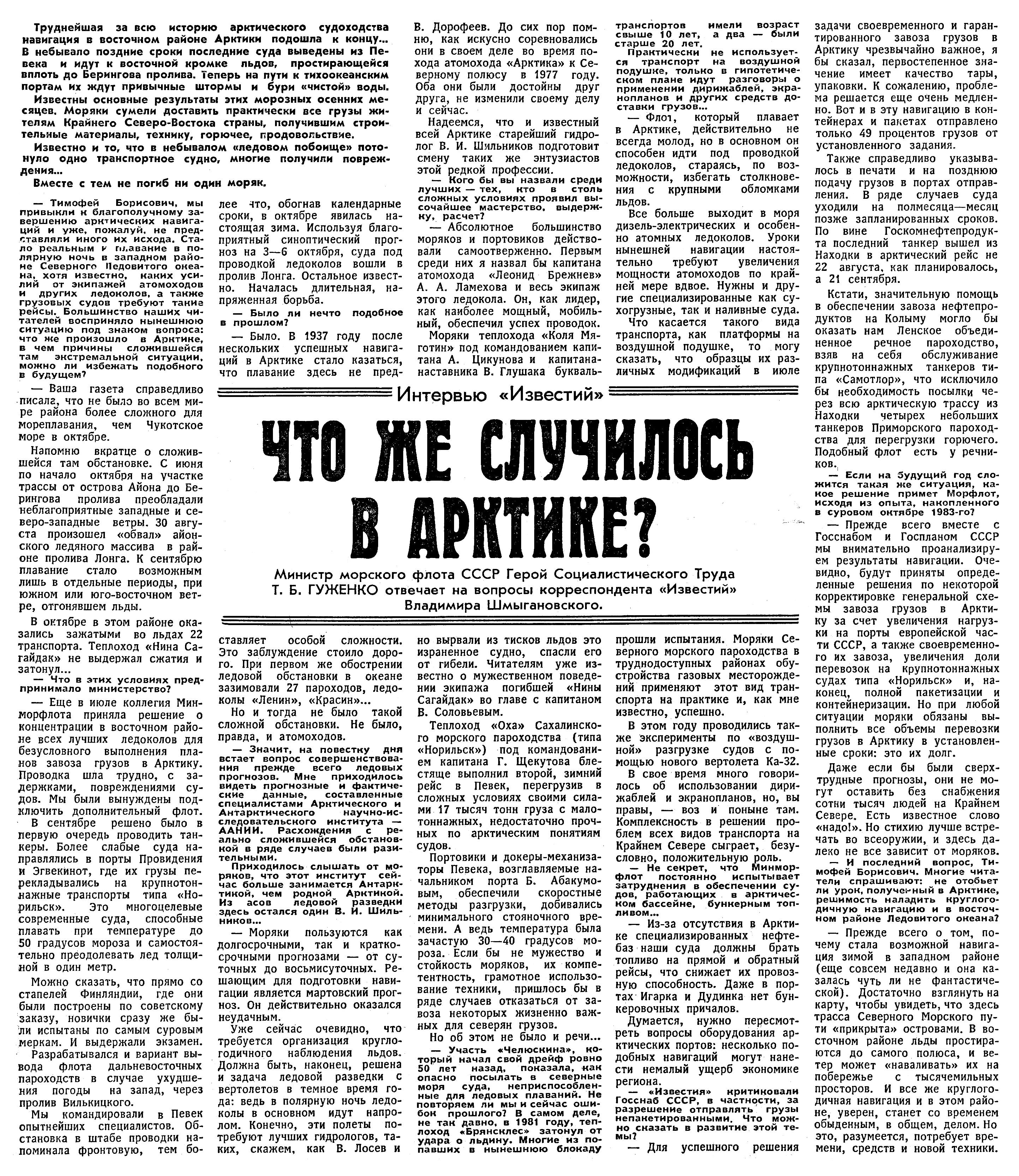 — Прежде всего вместе с Госснабом и Госпланом СССР мы внимательно проанализируем результаты навигации. Очевидно, будут приняты определенные решения по некоторой корректировке генеральной схемы завоза грузов в Арктику за счет увеличения нагрузки на порты европейской части СССР, а также своевременного их завоза, увеличения доли перевозок на крупнотоннажных судах типа «Норильск» и, наконец, полной пакетизации и контейнеризации. Но при любой ситуации моряки обязаны выполнить все объемы перевозки грузов в Арктику в установленные сроки: это их долг.