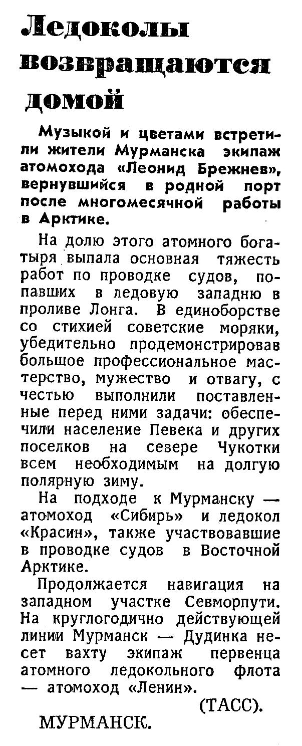На долю этого атомного богатыря выпала основная тяжесть работ по проводке судов, попавших в ледовую западню в проливе Лонга. В единоборстве со стихией советские моряки, убедительно продемонстрировав большое профессиональное мастерство, мужество и отвагу, с честью выполнили поставленные перед ними задачи: обеспечили население Певека и других поселков на севере Чукотки всем необходимым на долгую полярную зиму.