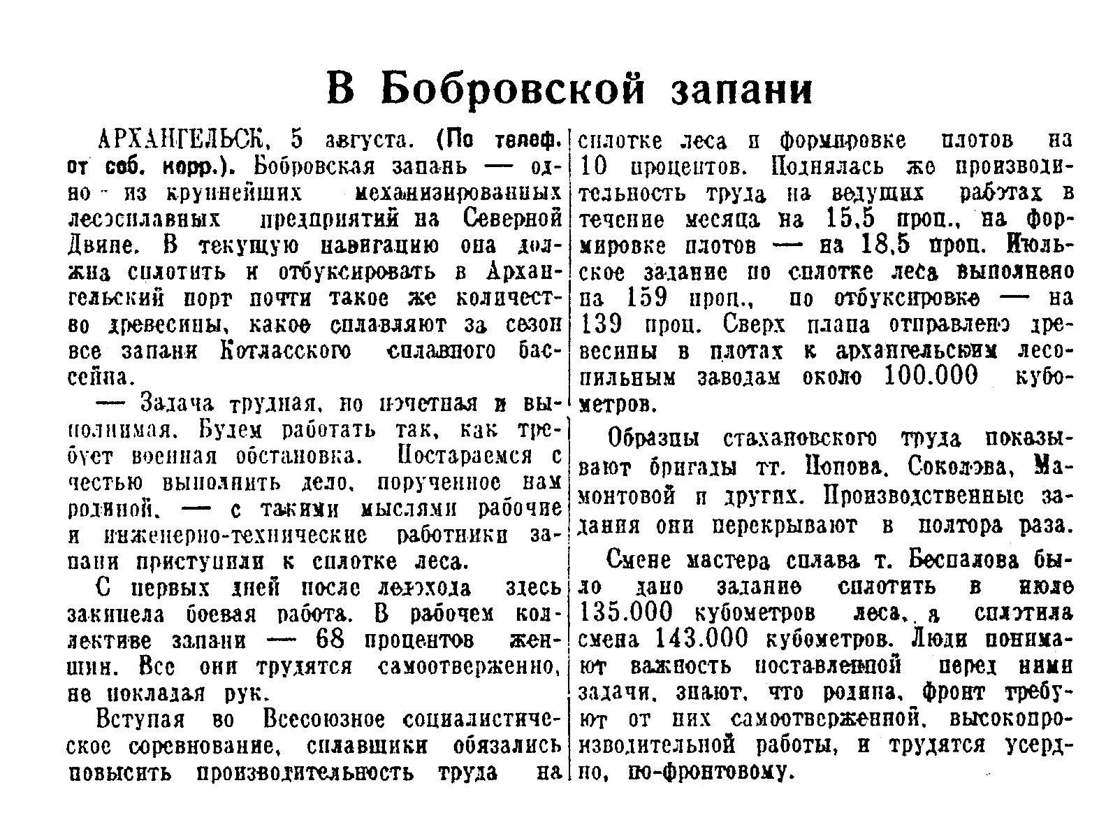Смене мастера сплава т. Беспалова было дано задание сплотить в июле 135.000 кубометров леса, а сплотила смена 143.000 кубометров. Люди понимают важность поставленной перед ними задачи, знают, что родина, фронт требуют от них самоотверженной, высокопроизводительной работы, и трудятся усердно, по-фронтовому.