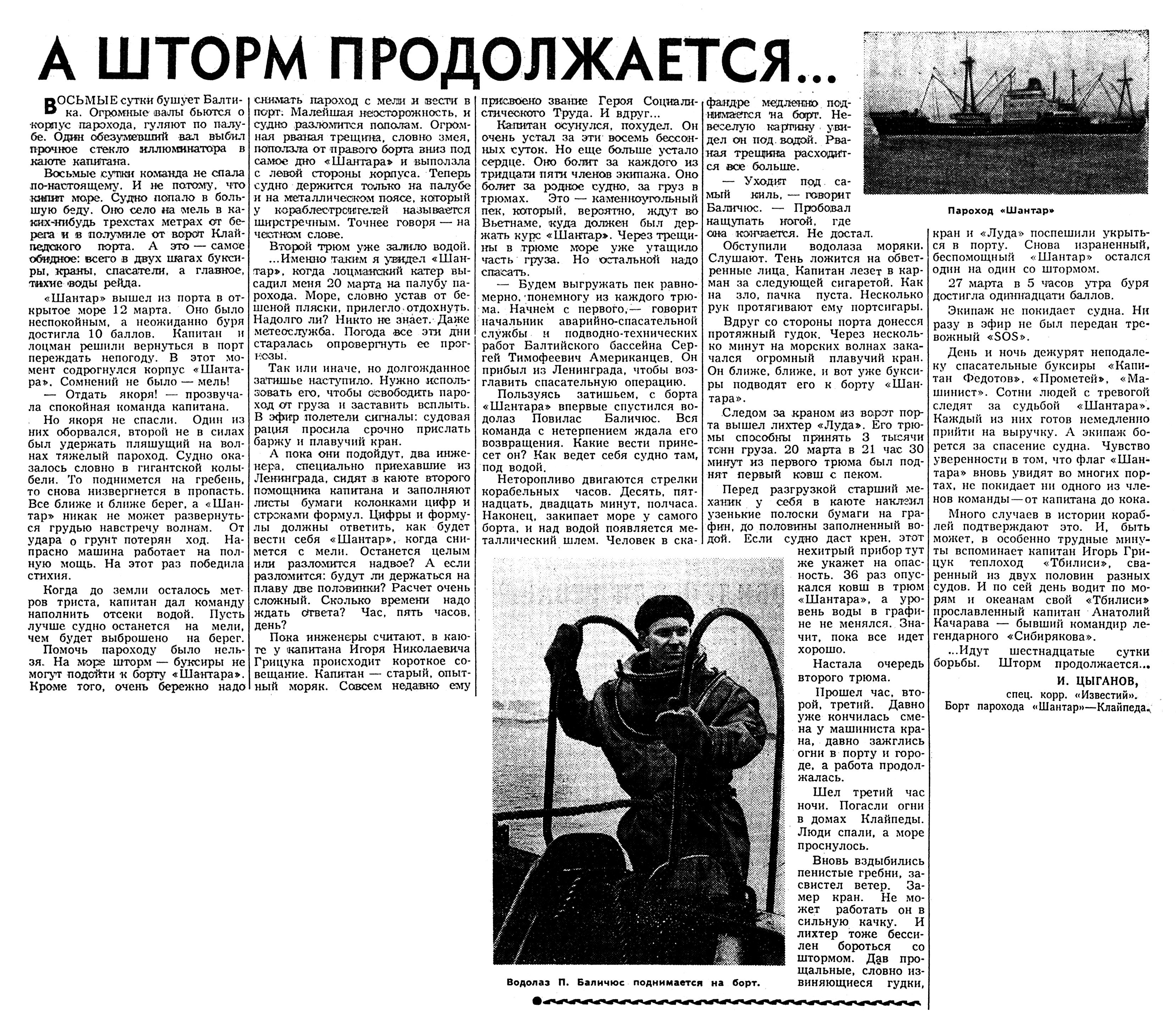 Об этой морской истории, разыгравшейся в водах Балтики, читатели «Известий» узнали несколько дней назад из репортажа «А шторм продолжается...». В нем рассказывалось о мужественной борьбе советских моряков за спасение парохода «Шантар», севшего на мель близ порта Клайпеда.
