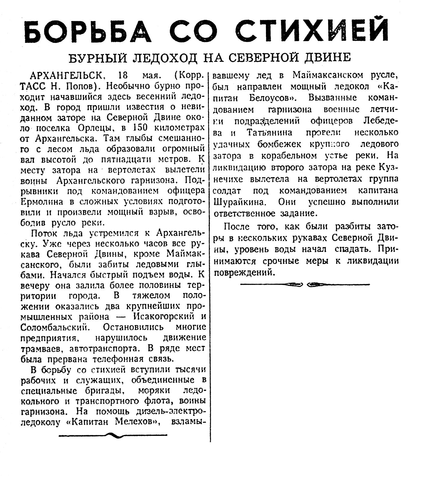 АРХАНГЕЛЬСК. 18 мая. (Корр. ТАСС Н. Попов). Необычно бурно проходит начавшийся здесь весенний ледоход. В город пришли известия о невиданном заторе на Северной Двине около поселка Орлецы, в 150 километрах от Архангельска. Там глыбы смешанного с лесом льда образовали огромный вал высотой до пятнадцати метров. К месту затора на вертолетах вылетели воины Архангельского гарнизона. Подрывники под командованием офицера Ермолина в сложных условиях подготовили и произвели мощный взрыв, освободив русло реки.
