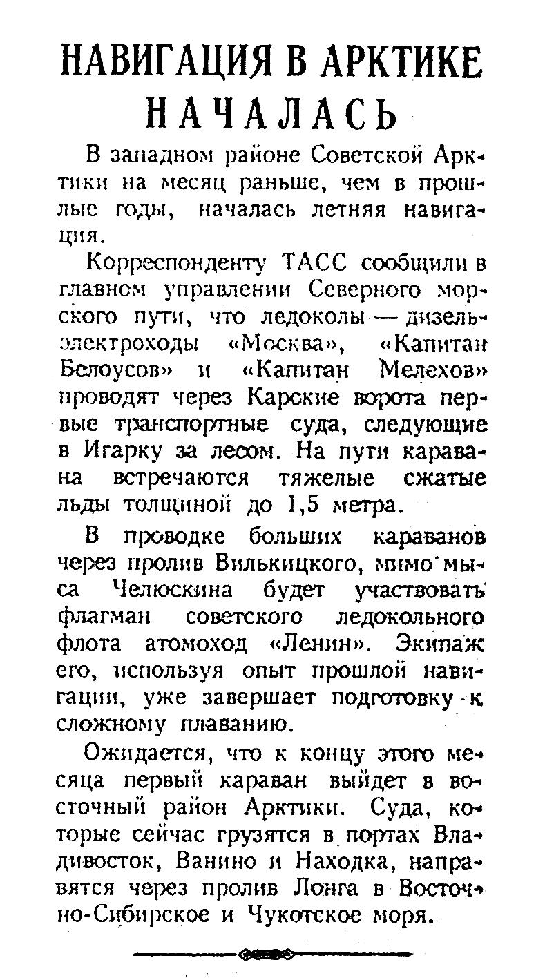 Корреспонденту ТАСС сообщили в главном управлении Северного морского пути, что ледоколы — дизель-электроходы «Москва», «Капитан Белоусов» и «Капитан Мелехов» проводят через Карские ворота первые транспортные суда, следующие в Игарку за лесом. На пути каравана встречаются тяжелые сжатые льды толщиной до 1,5 метра.